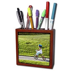 Child on tricycle, Whitefish Bicycle Path, Montana - US27 CHA1550 - Chuck Haney Tile Pen Holder is great on a desk or counter top. Made of high quality solid wood with a satin finish. Image displayed on one inset high gloss 4.25" x 4.25" ceramic tile. Overall size is 5" x 5" x 1 2/3" with 3- 1 1/3" top holes.